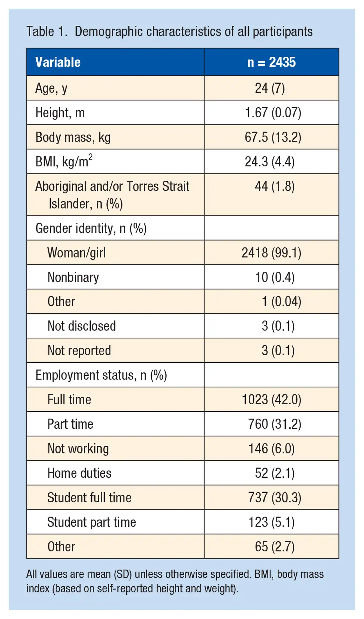 All injury outcomes, medical and women’s health factors, and sociodemographic characteristics were collated and summarized as frequencies and percentages or means and standard deviations as appropriate. For frequencies, to provide an estimate of uncertainty, we calculated CIs using the Clopper-Pearson method. We also presented the sociodemographic factors of interest by the subgroups of interest: (1) previous ACL injury; (2) previous significant knee injury (missing ≥4 weeks of training/games in any sport); (3) self-reported suspected concussion (in any sport or nonsport related); and (4) no injury (ie, players who did not report a history of ACL, significant knee injury or concussion).