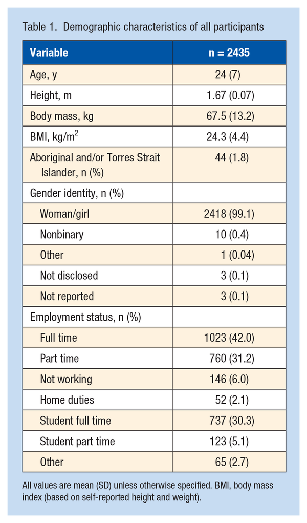 A total of 2574 community women AF players consented to participate in the clinical trial, of which 2435 completed the survey for the current study, with 571 players (23.5%) <18 years of age. Demographic characteristics are listed in Table 1 and Figure 1. One-quarter of the players (26%) had played <10 games of AF and half (50%) had played between 11 and 50 games.