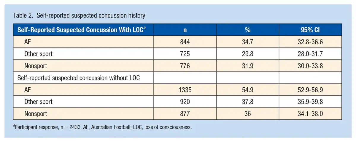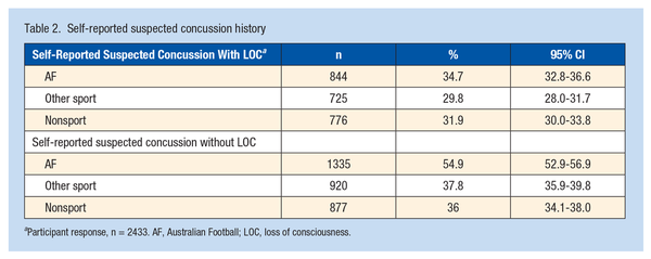 The data indicate that concussion may present a significant burden for women playing community AF, with over half of our sample (54.9%; n = 1337) of players reporting a history of suspected concussion without LOC and over one-third (34.7%; n = 845) reporting a history of suspected concussion with LOC. This concurs with a previous small self-reported survey (33%) in community women’s AF,, and is higher than concussion levels reported in men’s community AF., Higher levels of concussion in women have also been reported in other ball sports., The high levels of suspected concussion reported in our study may also indicate increased community awareness about concussion and its potential serious consequences. In the past, many concussions were not reported, which may have been associated with poor concussion-related knowledge.,, The results of this survey suggest that concussion in women and girls playing community AF warrants further investigation to better understand the number, mechanism, and potential prevention strategies. It is important that coaches, trainers, and players recognize the significance of a concussion diagnosis for women and girls, follow the AFL concussion guidelines, and understand that it may take longer for women to fully recover from a concussion and return to play than men.,