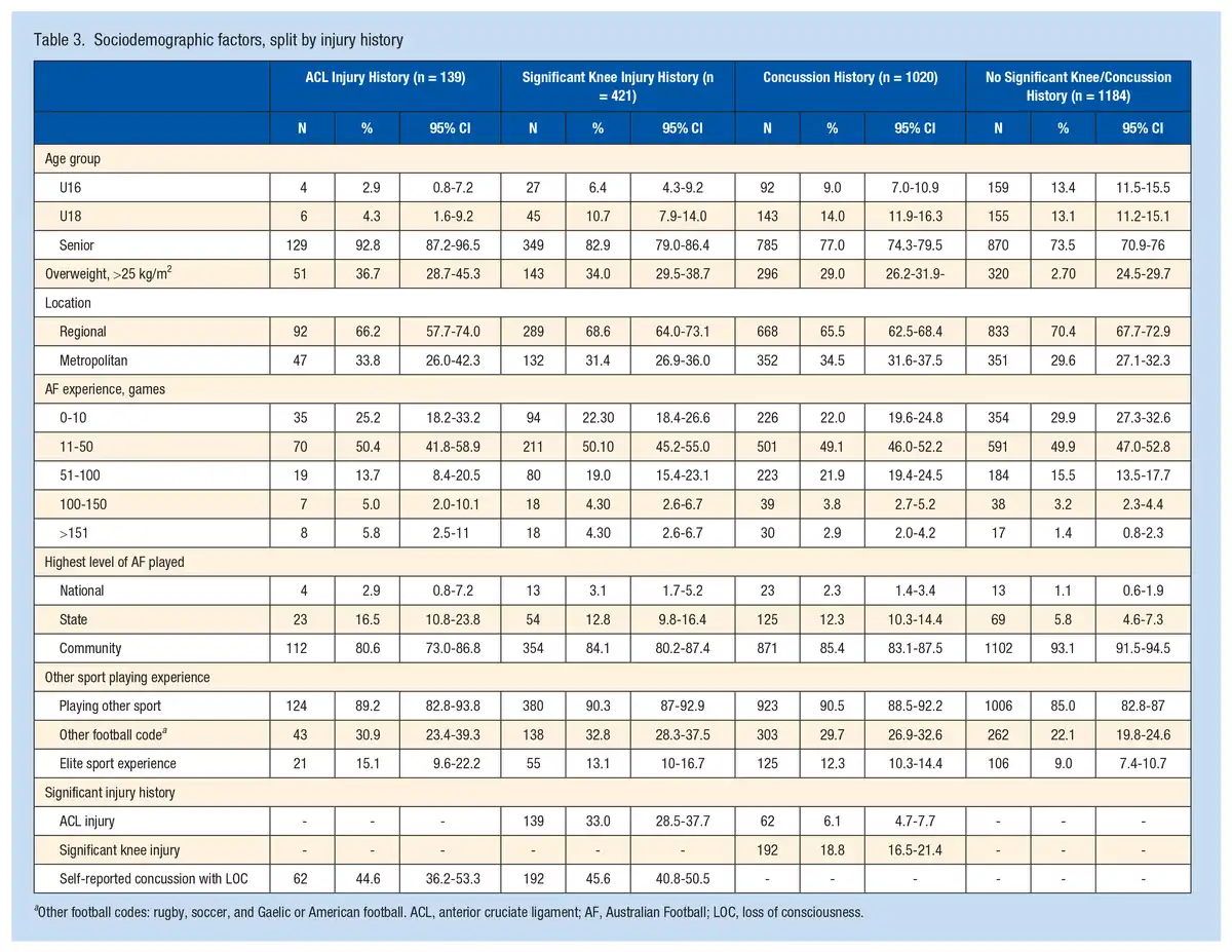 We fitted a series of univariable logistic regression models to explore relationships between current sociodemographic factors and the dependent variables of previous ACL injury, significant knee injury, and self-reported suspected concussion history. The independent variables used were age, body mass index (BMI), highest level of AF (ordered factor), number of games played (ordered factor), previous participation in other competitive sports, previous participation in other football codes, location (metropolitan, regional), and socio-economic index (IRSAD decile). All analysis was conducted in R (R Foundation for Statistical Computing).