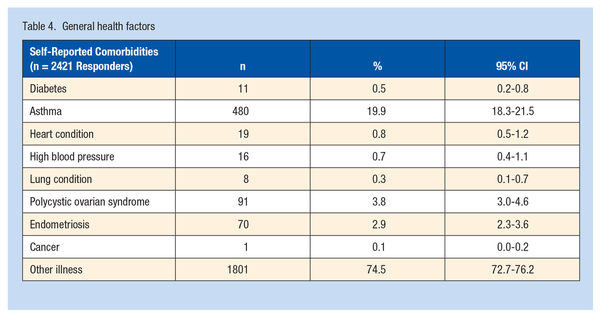 Self-reported general health factors are detailed in Table 4 with the asthma being the most prevalent self-reported comorbidity.
