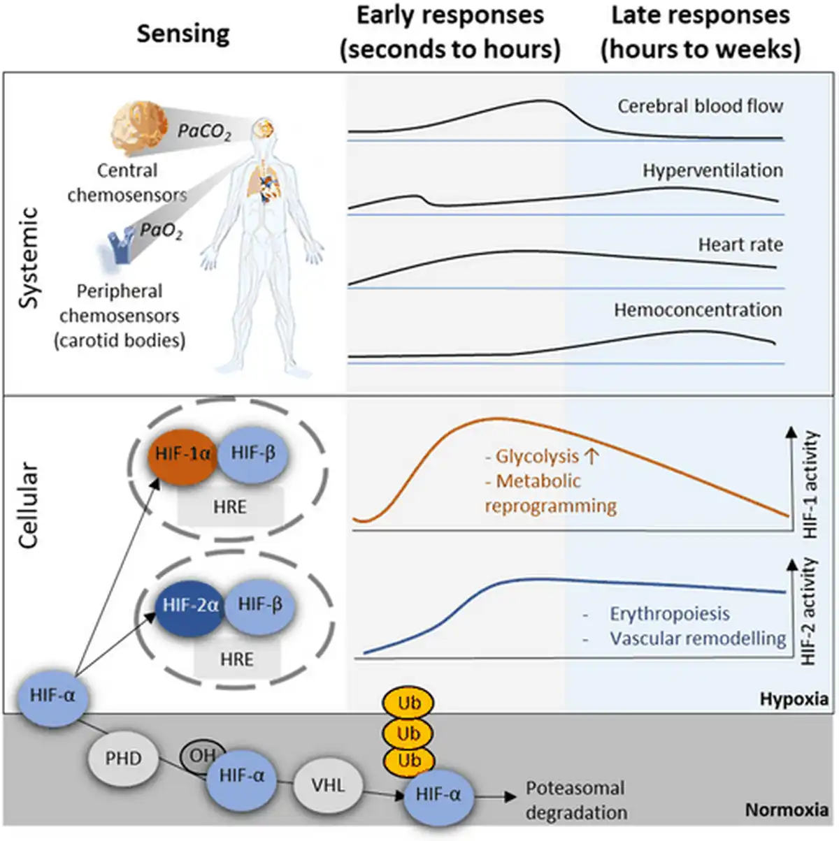 1. From cellular and systemic hypoxia sensing to hypoxia responses and adaptations. On the systemic levels reduced partial pressures of oxygen (PaO2) and associated reduced partial pressures of CO2 (PaO2) are sensed by specialized chemosensors. Of these, the carotid bodies likely are the most important components for the induction of the major systemic hypoxia responses. Among the many cellular mechanisms involved in hypoxia sensing, hypoxia-inducible factors (HIF) are especially prominent. While the α subunits of both HIF-1 and HIF-2 are degraded in normoxia via hydroxylation (OH) through prolyl dehydroxylases (PHD), von Hippel-Lindau protein (VHL) recognition and poly-ubiquitination (Ub), in hypoxia they stabilize and regulate genes via hypoxia response elements (HRE).