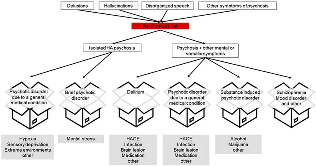 - Hüfner K, Falla M, Brugger H, Gatterer H, Strapazzon G, Tomazin I, et al Isolated high altitude psychosis, delirium at high altitude, and high altitude cerebral edema: are these diagnoses valid? Front Psychiatry. 2023;14:1221047.