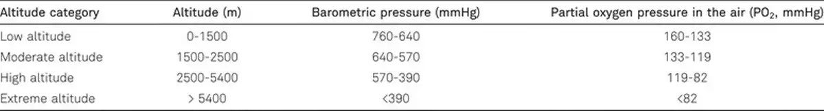 The exposure to high or extreme altitude is often associated with different environmental and behavioral challenges. The defining environmental alteration with increasing altitude is the decreasing barometric pressure and therefore a dropping partial pressure of oxygen in the air (Table 1). Increasing altitudes are also characterized by on average lower temperatures (as compared to the respective climatic region, about -6.5°C per 1000 m altitude), which can have complex effects on hypoxia adaptations []. If the altitude exposure is combined with physical challenges (e.g., during mountaineering), additional important interactions of the physiological responses to hypoxia with the increased oxygen demand especially of working muscles, respiratory and cardiovascular systems have to be expected.