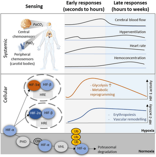 1. From cellular and systemic hypoxia sensing to hypoxia responses and adaptations. On the systemic levels reduced partial pressures of oxygen (PaO2) and associated reduced partial pressures of CO2 (PaO2) are sensed by specialized chemosensors. Of these, the carotid bodies likely are the most important components for the induction of the major systemic hypoxia responses. Among the many cellular mechanisms involved in hypoxia sensing, hypoxia-inducible factors (HIF) are especially prominent. While the α subunits of both HIF-1 and HIF-2 are degraded in normoxia via hydroxylation (OH) through prolyl dehydroxylases (PHD), von Hippel-Lindau protein (VHL) recognition and poly-ubiquitination (Ub), in hypoxia they stabilize and regulate genes via hypoxia response elements (HRE).