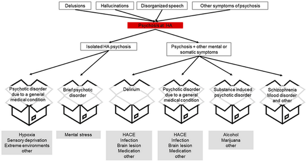 2. Psychotic symptoms are transdiagnostic, meaning that they can be a symptom of different disorders. It is essential to try and correctly assign psychotic symptoms to a diagnostic entity in order to provide the correct treatment. This can be challenging, especially at high altitude (HA). Source: []. © 2023 Hüfner, Falla, Brugger, Gatterer, Strapazzon, Iztok, Zafren, Sperner-Unterweger, Fusar-Poli. https://doi.org/10.3389/fpsyt.2023.1221047. Distributed under the terms of the Creative Commons Attribution License CC BY 4.0 (https://creativecommons.org/licenses/by/4.0).