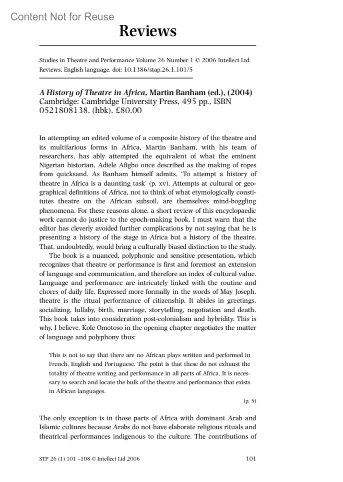 A History of Theatre in AfricaLayiwola, Professor DeleStudies in Theatre and Performance 26(1):p 101-102, January 1, 2006.Copyright ©2006 Intellect Ltd