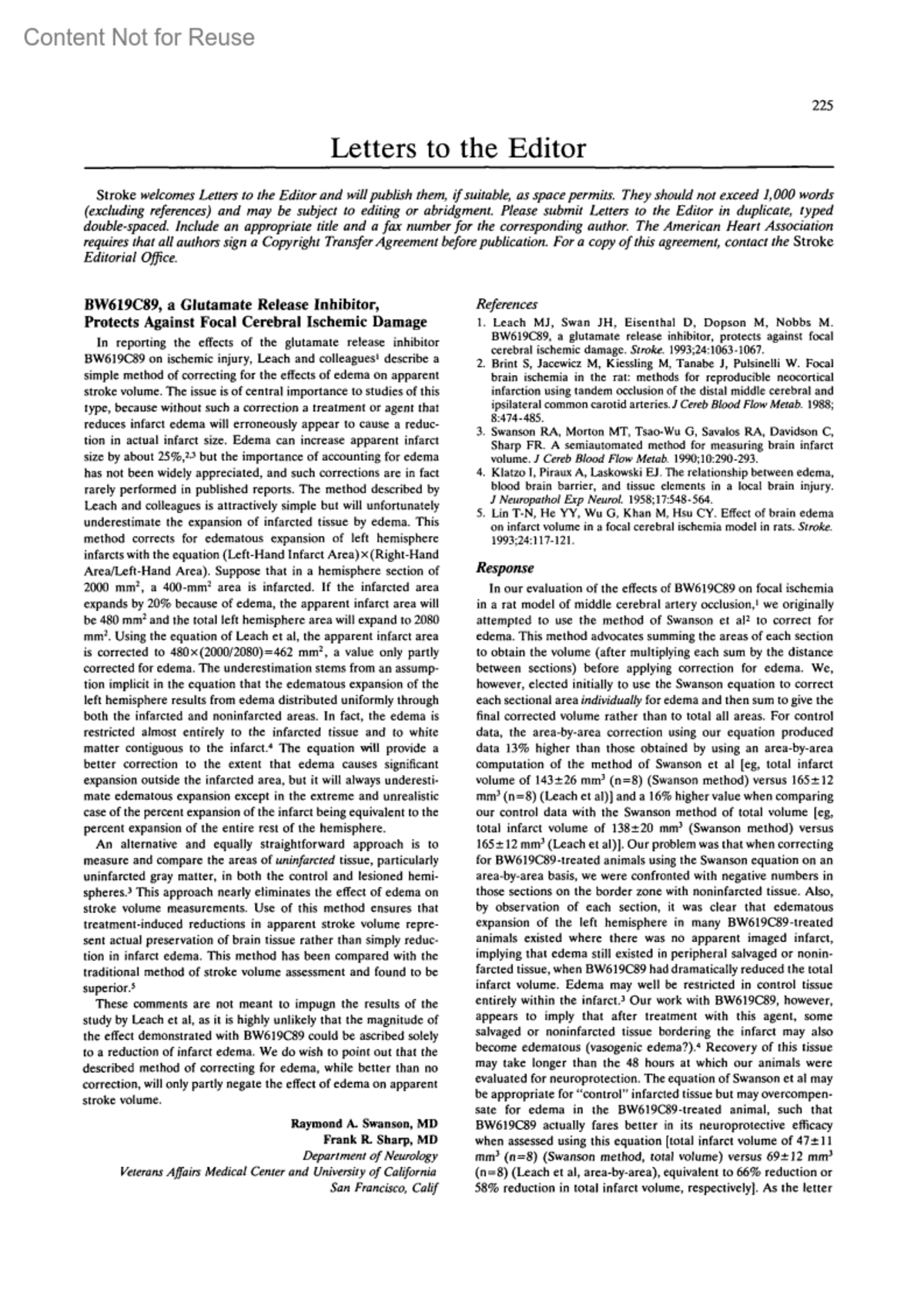 BW619C89, a Glutamate Release Inhibitor, Protects Against Focal Cerebral Ischemic DamageLeach, Michael J. PhDSwan, Jeanette H. PhDAuthor informationDepartment of Pharmacology, Wellcome Research Laboratories, Kent, UKStroke 25(1):p 225-226, January 1994.Copyright © 1994 American Heart Association, Inc.