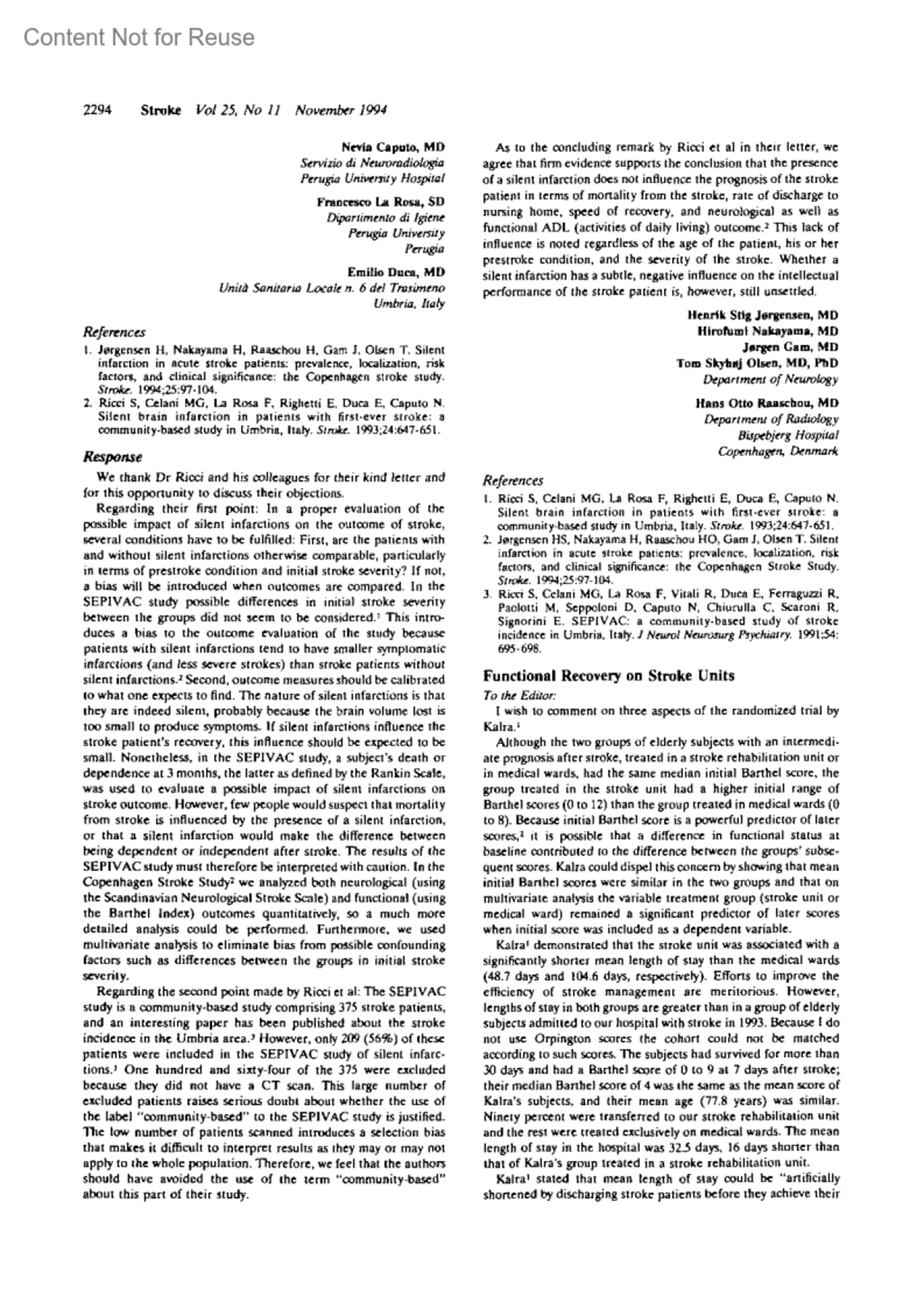 Silent Infarctions in First-Ever Stroke PatientsJørgensen, Henrik Stig MDNakayama, Hirofumi MDGam, Jørgen MDOlsen, Tom Skyhsj MD, PhDRaaschou, Hans Otto MDAuthor informationDepartment of NeurologyDepartment of Radiology Bispebjerg Hospital Copenhagen, DenmarkStroke 25(11):p 2294, November 1994.Copyright © 1994 American Heart Association, Inc.
