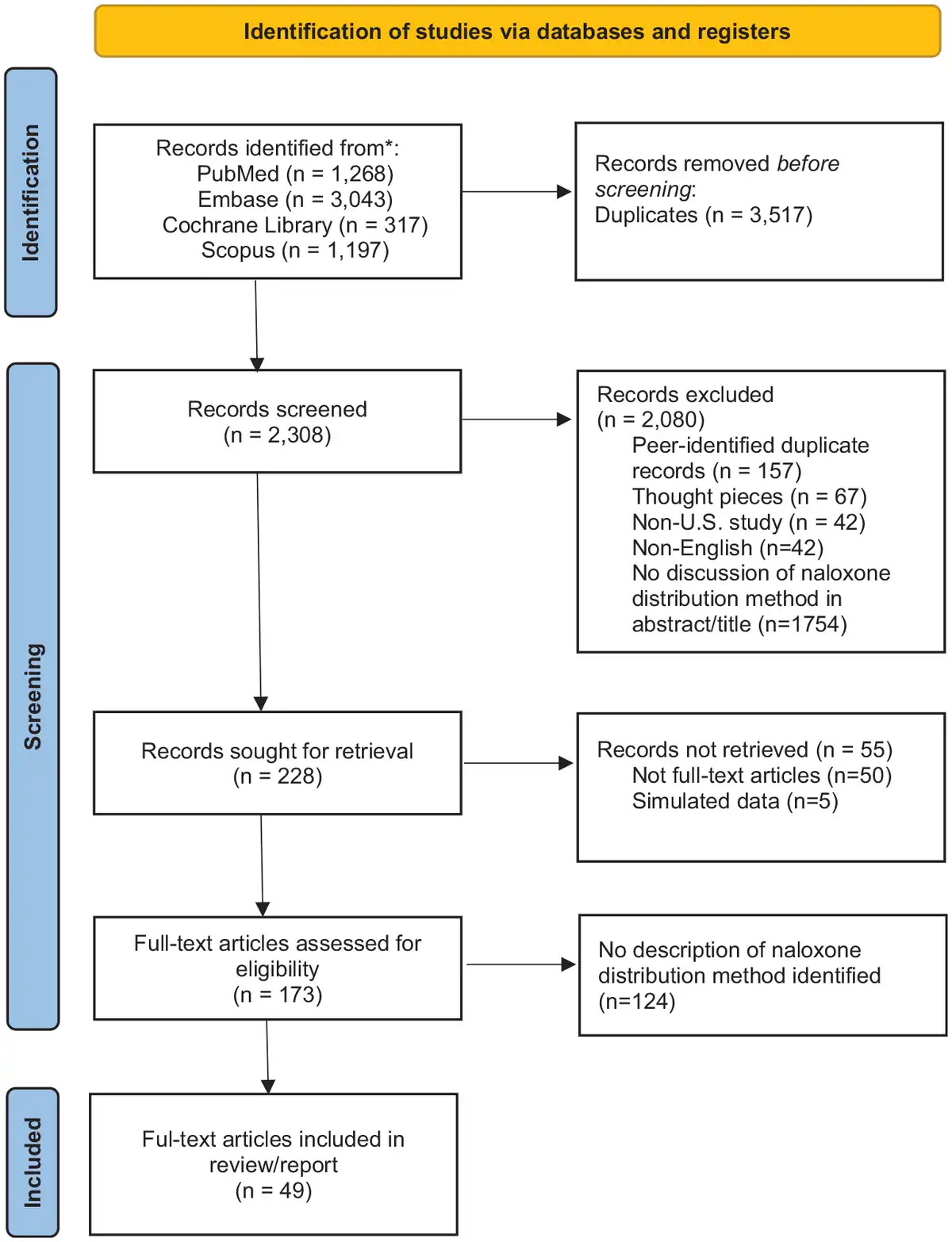 Search terms were developed from 3 concepts: (1) narcan/naloxone; (2) OEND; and (3) naloxone distribution setting. A combination of these keywords and controlled vocabulary were utilized to develop the search strategy. Four databases from database inception to May 28, 2023: (1) PubMed/Medline (National Library of Medicine), (2) Embase (Elsevier), (3) Scopus (Elsevier), and (4) Cochrane library. The search strategy developed in PubMed/Medline was translated to the other databases. Supplemental Appendix 1 contains the full search strategies for all databases. All identified records from all sources were imported into citation management software EndNote and deduplicated before screening began.