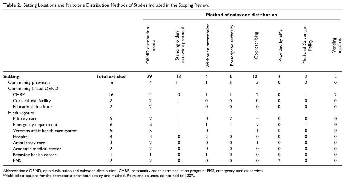 To the best of our knowledge, this is the only scoping review to broadly describe all types of naloxone distribution models in the United States. These findings highlight the many settings and modes of naloxone distribution, as well as their strengths/limitations.