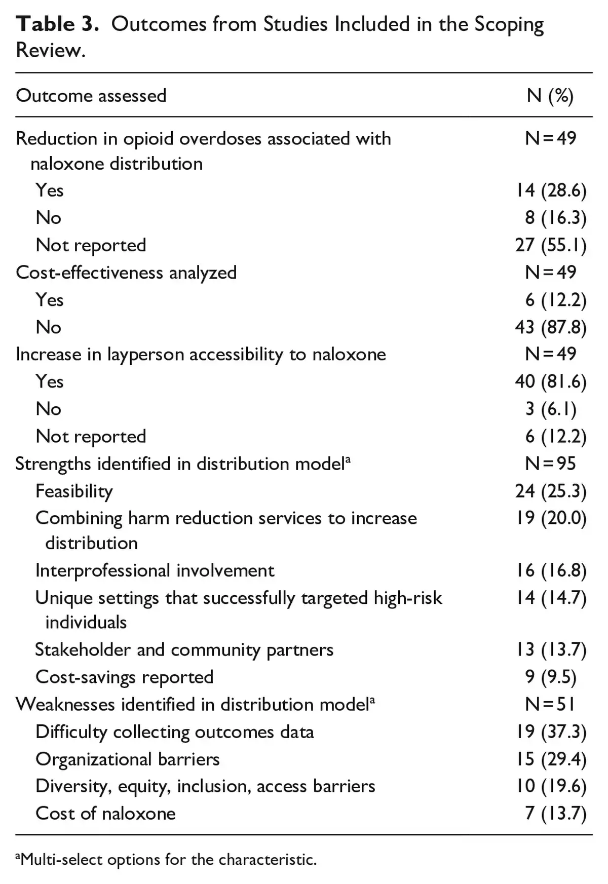 Since this was a scoping review and not a systematic review, a quality assessment was not conducted for the studies included. Future research may consider conducting a systematic review to provide further insights on the strengths and weaknesses of current naloxone distribution models in the United States. This study did not investigate what factors are associated with successful naloxone distribution (eg, increase in patient access, reduction in OODs, cost savings). Lastly, a broad search strategy was used, but it is possible additional articles were missed based on slight differences in terminology.