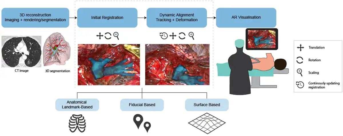 Correct alignment and visualization of the 3D models onto the surgical field necessitates several steps, identified as the AR-workflow: 1. 3D reconstruction, 2. initial registration, 3. dynamic tracking, and 4. AR visualization (Figure 1)., While the AR-workflow has been increasingly implemented for surgical navigation, most applications consider target organs that maintain a constant spatial relationship with adjacent anatomical structures. As such, most research has been performed for neurosurgery, otolaryngology, and orthopedic surgery. Therefore, it is essential to understand that registration is further divided in two subtypes, rigid and non-rigid registration. Rigid registration considers translation, rotation, and scaling while deformations of the object are not considered. Rigid registration is particularly suited for these aforementioned specialties eg, orthopedic surgery., Registration of deformable organs with their rigid preoperative 3D models is more challenging due to inherent organ movement and deformation, requiring more extensive non-rigid registration that does acknowledge deformation to achieve correct alignment. Therefore, the application of AR in pulmonary surgery, and surgery of other types of deformable organs/non-rigid organs, remains limited. During RATS/VATS procedures, the lungs undergo further deformation, including intraoperative collapse of the lung, altered effects of gravity due to difference in patient positioning, and manipulation by the surgeon. These factors impose additional challenges for AR alignment of the 3D models onto the surgical view.,- Successful application of AR should meet the specific needs for pulmonary surgery, focusing on correct alignment of the complex broncho-vascular anatomy and its relationship with the tumor, particularly considering the extended deformation of a collapsed, highly movable, and pliable lung.