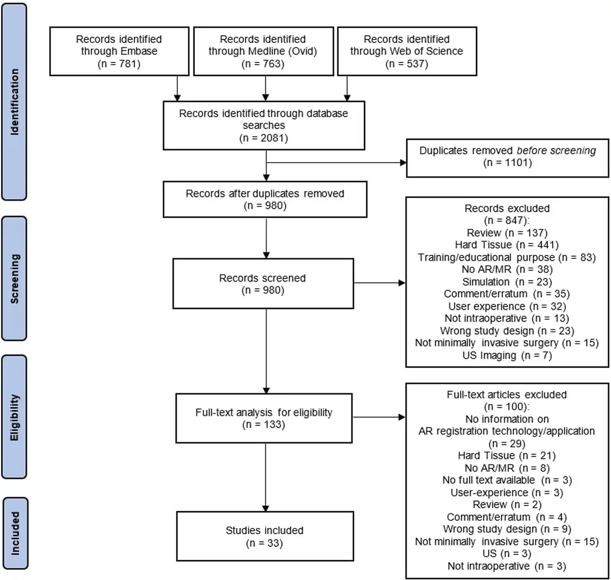Exclusion of articles was performed along the following criteria: 1. Review articles; 2. Registration/Navigation based on bony structures; 3. Training/Simulation/Educational purpose; 4. No application of AR/MR; 5. Comment/Erratum to article; 6. User-experience; 7. Non intraoperative application; 8. Open surgery; 9. Ultrasound as imaging modality; 10. No information of the (XR) technology/application; and 11. No full text available.