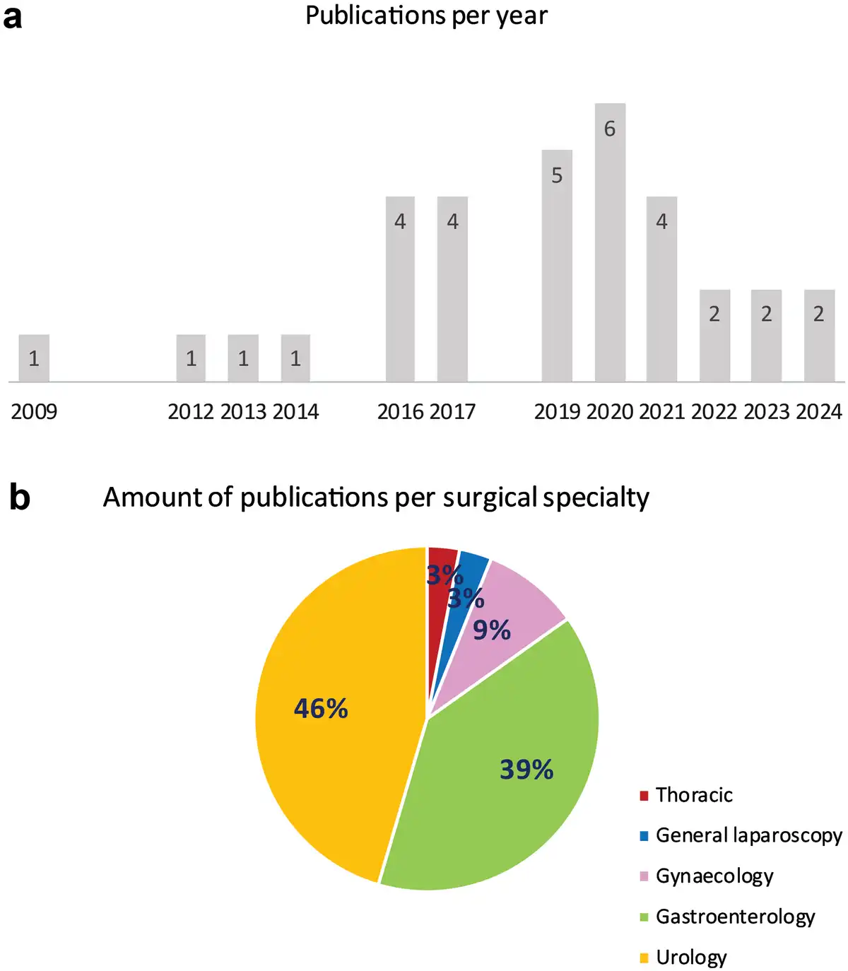 (A) Number of publications on AR for minimally invasive deformable organ surgery per year according to our search strategy, between 2009 and 2024, and b) per surgical specialty.