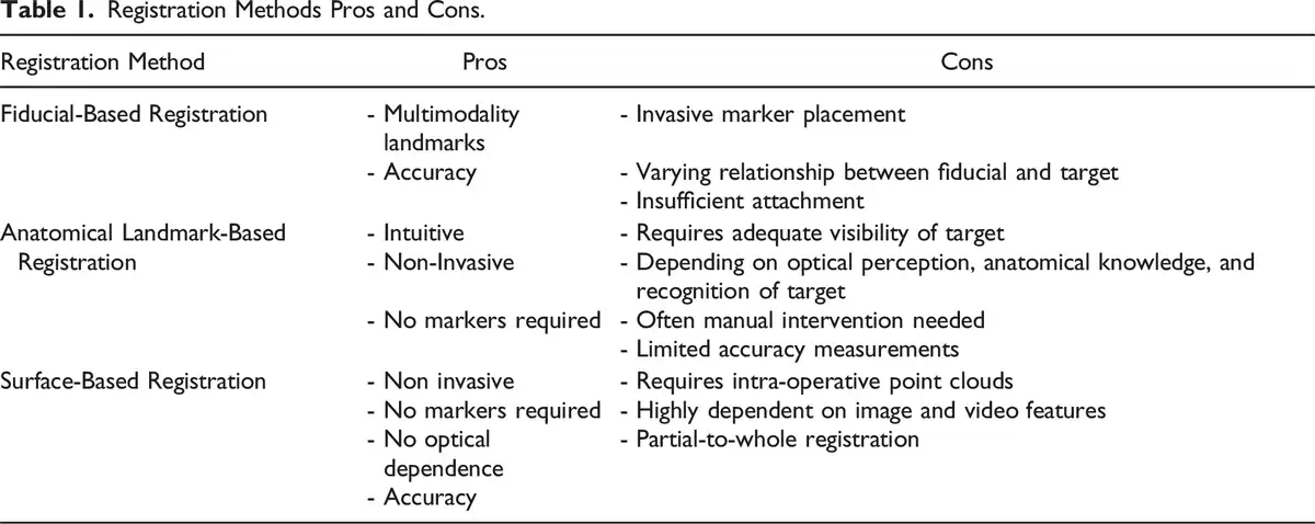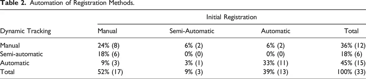 Articles were sorted according to initial registration and dynamic tracking. The three classified types of registration are surface, anatomical landmark, and fiducial-based registration. Surface-based registration was applied in 16 studies (48%), anatomical landmark-based registration in 12 (36%), and fiducial based registration in only 5 studies (15%). An overview of the pros and cons of the different registration techniques is shown in Table 1. For initial registration, 52% (n = 17) of the studies performed manual registration, 9% (n = 3) semi-automatic, and 39% (n = 13) fully automatic (Table 2). For dynamic tracking, 36% (n = 12) were performed manually, 18% (n = 6) semi-automatic, and 45% (n = 15) fully automatic. Manual registration for initial registration, tracking, or both was performed in 88% (n = 29) of all studies. Complete manual registration was performed in 8 studies (24%).,-