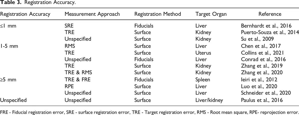 The included studies have investigated varying outcome measures. Eleven (33%) studies have based the evaluation of their results on the surgical outcomes like operative time, blood loss, hospitalization time and postoperative complications.-,- Other studies assessed registration time (n = 7, 21%),,,,- resection margin accuracy (n = 3, 9%),,, robustness to noise or occlusion of view (n = 2, 6%),, calibration accuracy (n = 1, 3%), identification precision (n = 1, 3%), and spatial perception (n = 1, 3%). Furthermore, 36% (n = 12) of the articles evaluated registration accuracy (Table 3),,,,,,,,,,,, using varying metrics. In general, registration accuracy refers to the distance error between the aligned target and the real object. Target registration error (TRE) is used for different types of registration methods, whilst fiducial registration error (FRE) is referred to for fiducial-based methods, and surface registration error (SRE) is used for a surface-based application. Root mean square distance (RMSD) was measured in two of the 12 (17%) studies assessing accuracy., A large proportion of studies evaluating accuracy measured TRE (n = 5, 42%).,,,, A registration accuracy of below five mm was achieved by eight of the 12 (67%) studies,,,,,,, and three articles (25%) have presented a submillimeter accuracy.,,