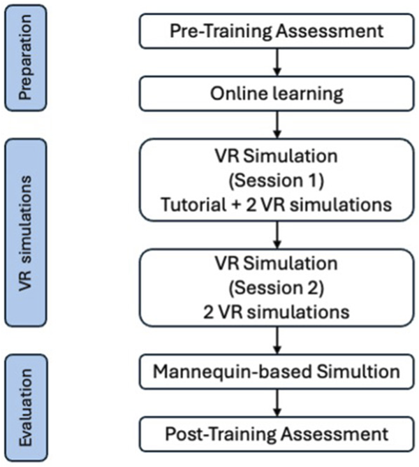 Immersive VR simulation was provided using the chest tube module of a commercially available product (Vantari VR, Sydney, Australia) delivered through a Quest 2 VR Headset (Meta, Menlo Park, CA, United States) and its hand controllers.,, The system situates a learner in a fully immersive virtual operating room environment, and learners receive detailed verbal instructions for 26 steps to execute the procedure while the steps are highlighted on the screen (Figure 2). The module also provides real-time feedback, based on its embedded metrics and data, and reports time to complete each step and total procedure. The study team had verified that the instructions in the VR simulation were aligned with the Advanced Trauma Life Support guidelines.