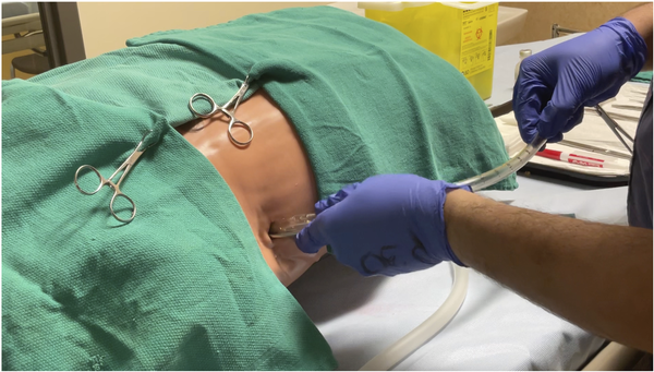 The time taken during each VR iteration and total VR times were measured. Participants’ knowledge about chest tube insertion was assessed by a 15-item multiple-choice assessment conducted pre- and post-training., Technical skills were assessed by an experienced surgeon using a modified Objective Structured Assessment of Technical Skills (OSATS) score (5-point, 11 items) (Supplemental material 3) as participants performed chest tube insertion on a mannequin (Figure 3). In this secondary analysis, we analyzed technical skill (OSATS scores) and knowledge as they relate to usability and cognitive load.