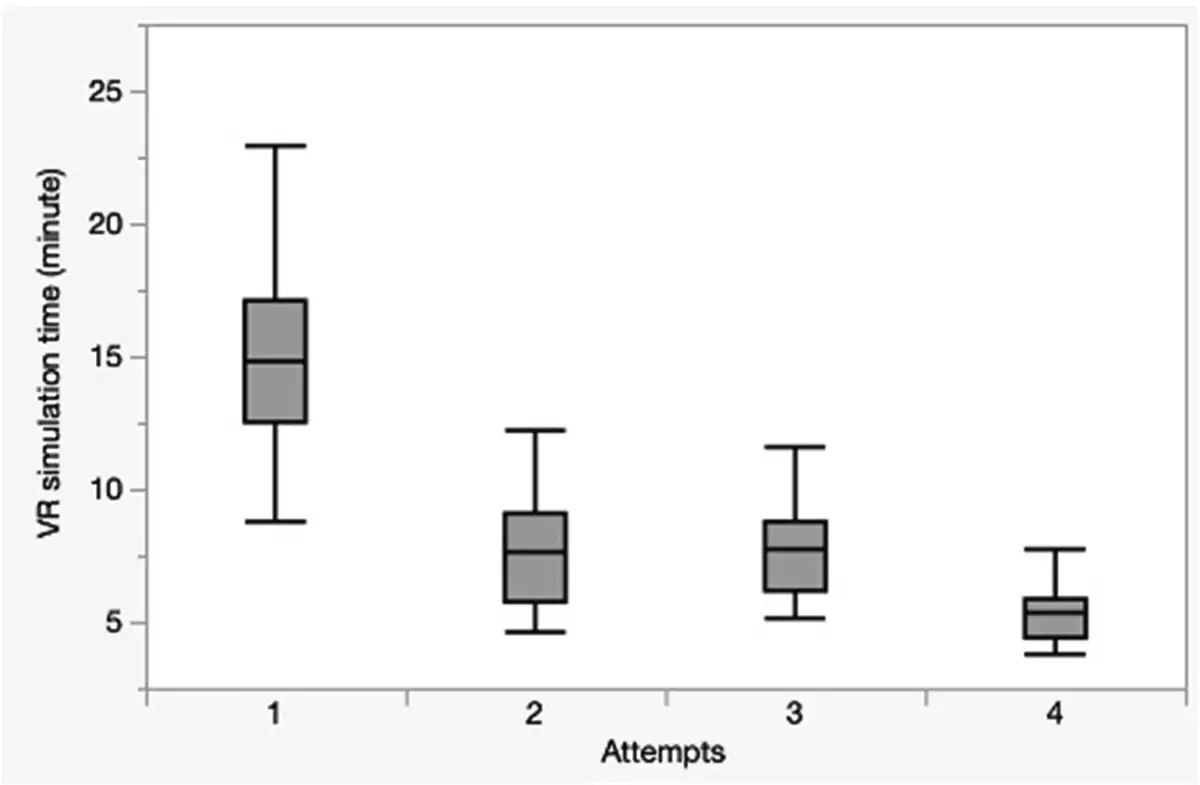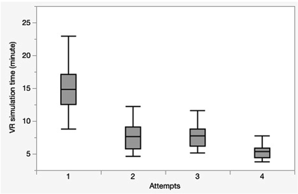 Learning curve: time to complete 4 VR simulations. Median score significantly improved over the course of study. Box plot shows median score, inter-quartile range; whiskers show range. VR, virtual reality.