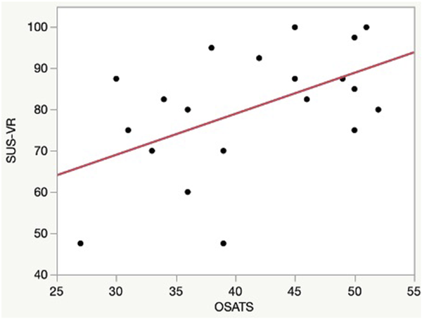 Regression analysis: Relationship between technical performance (chest tube OSATS score) and usability (SUS score). There was significant positive correlation between OSATS score and SUS (r = 0.51, P = 0.04). OSATS, objective structured assessment of technical skill; SUS, system usability scale.