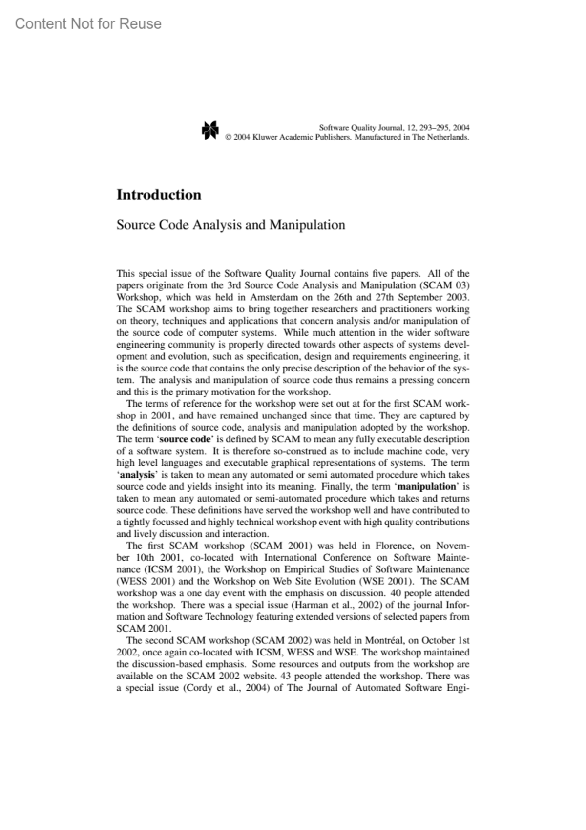IntroductionSource Code Analysis and ManipulationBinkley, DavidBurd, LizHarman, MarkTonella, PaoloSoftware Quality Journal 12(4):p 293-295, December 2004.Copyright ©2004 Kluwer Academic Publishers