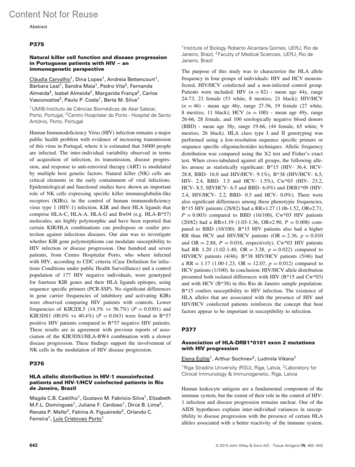 Association of HLA-DRB1*0101 exon 2 mutations with HIV progressionP377Eglite, ElenaSochnev, ArthurViksna, LudmilaAuthor information1Riga Stradins University (RSU), Riga, Latvia, 2Laboratory for Clinical Immunology & Immunogenetic, Riga, LatviaTissue Antigens 75(5):p 642-643, May 2010.Copyright © 2010 Blackwell Publishing Ltd.