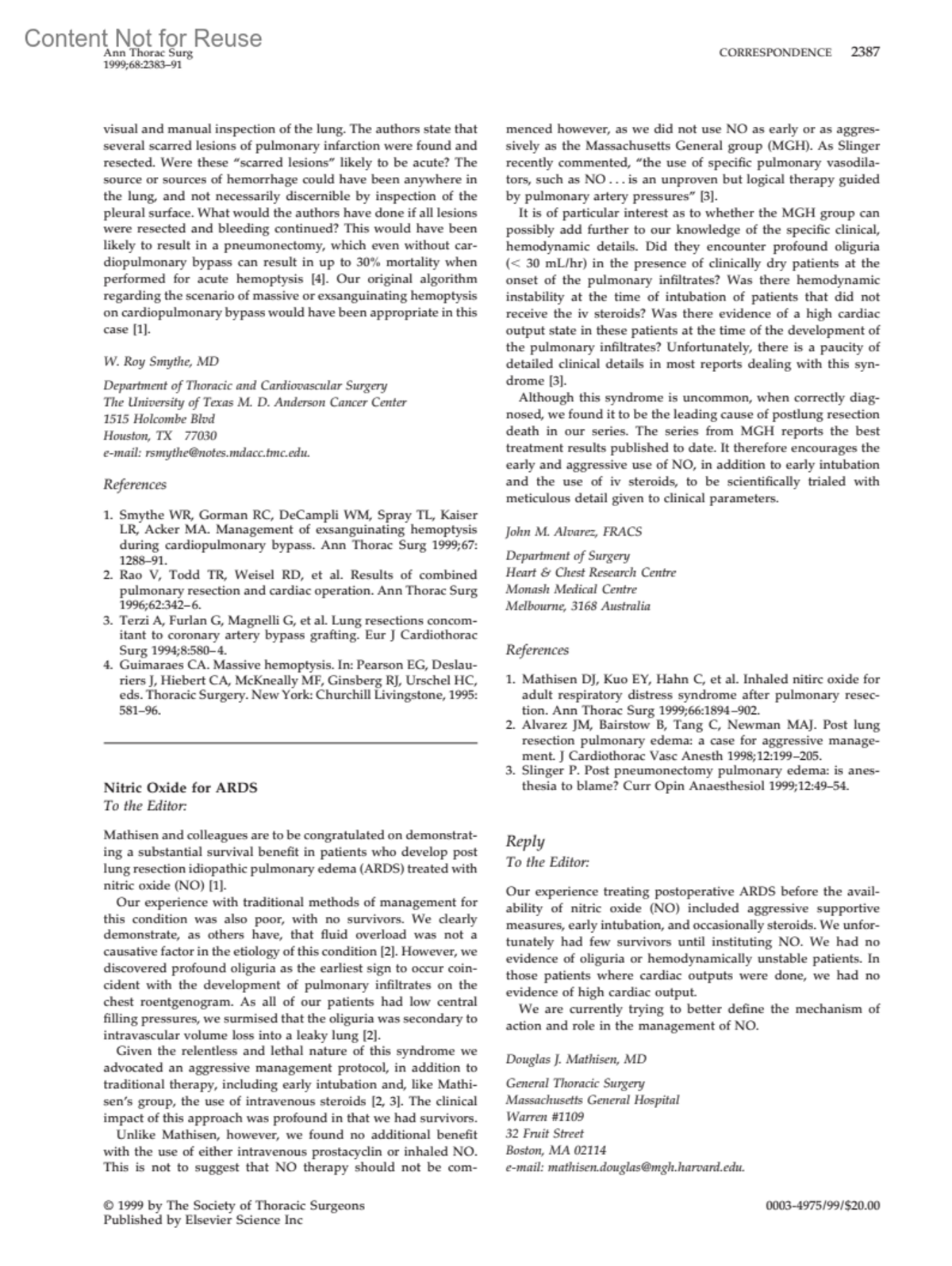 Management of exsanguinating hemoptysis during cardiopulmonary bypassMathisen, Douglas J MDAuthor informationaGeneral Thoracic Surgery, Massachusetts General Hospital, Warren #1109, 32 Fruit Street, Boston, MA, 02114 USA; e-mail: [email protected]The Annals of Thoracic Surgery 68(6):p 2387, December 1999.Copyright ©1999 Elsevier, Inc.