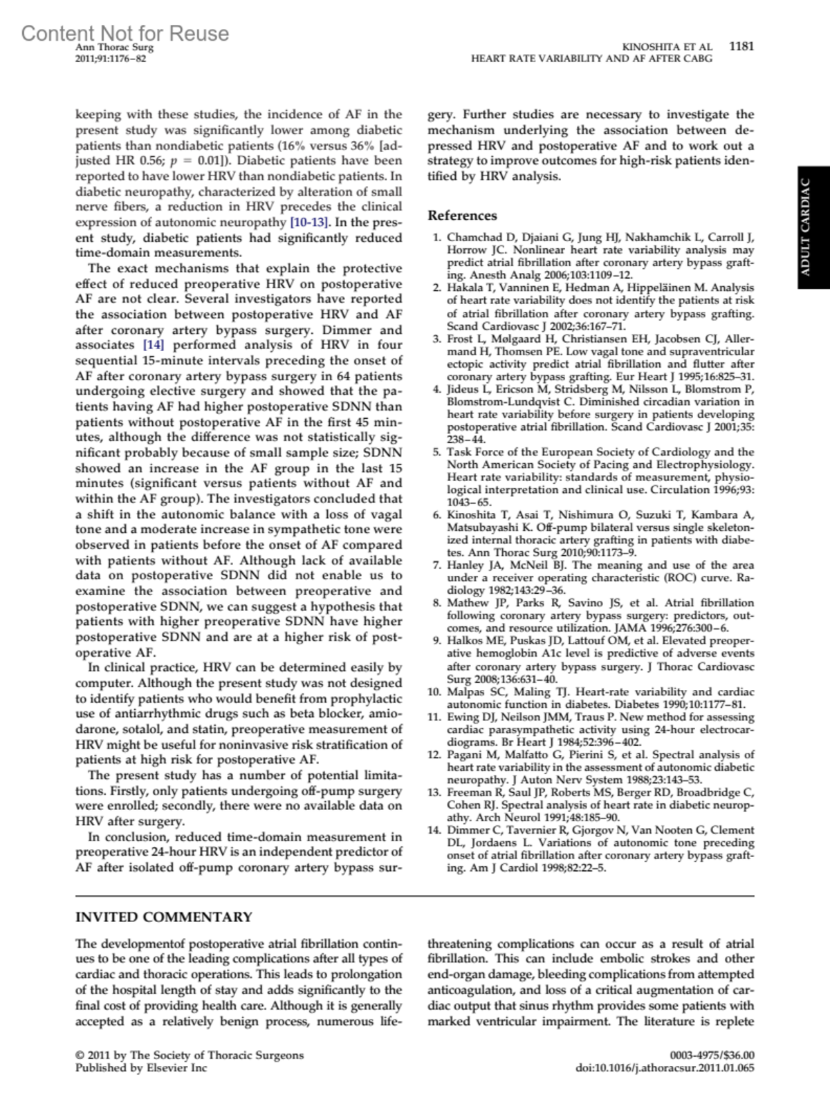 Preoperative Heart Rate Variability Predicts Atrial Fibrillation After Coronary Bypass GraftingJoyce, Lyle MD, PhDAuthor informationCardiovascular Surgery, Mayo Clinic, 200 First St SW, Rochester, MN 55905e-mail:[email protected]The Annals of Thoracic Surgery 91(4):p 1181-1182, April 2011.Copyright ©2011 Elsevier, Inc.
