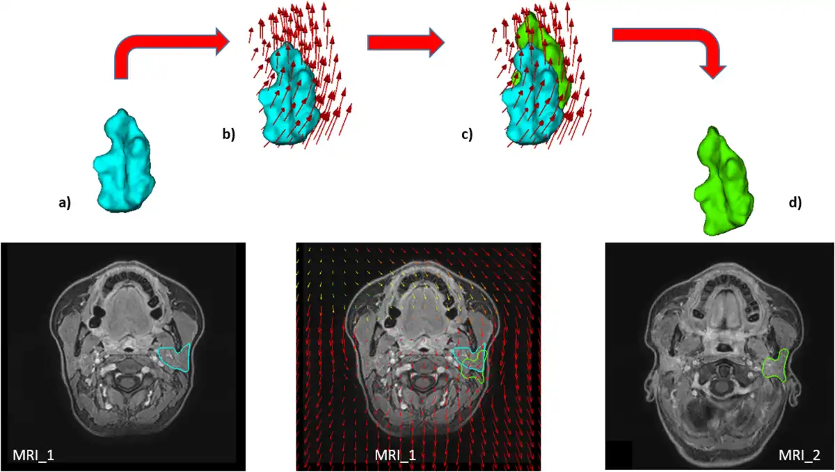 Once the image registration step was performed, contours delineated on MRI_1 were automatically propagated on MRI_2 using 2 different approaches, both starting with the deformation field estimated by Elastix.