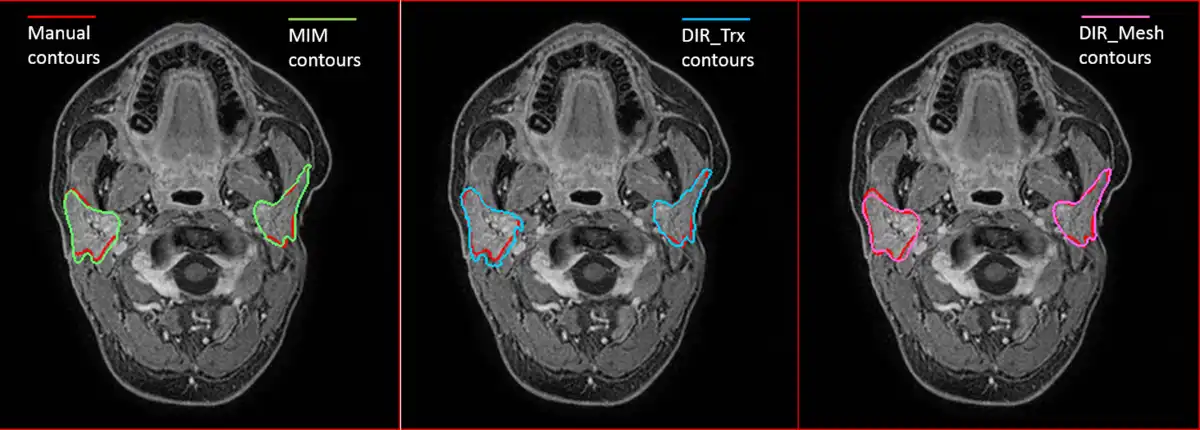 In few cases, contour propagation failed, in particular when MIM was considered; this happened when big deformations and changes in parotid shape occurred (see Figure 5A and B, where a clear difference in head and parotid shape is shown). In this case, MIM had a greater difficulty in recovering parotid contours (green line in Figure 5C), with respect to the other 2 methods (light blue and purple line in Figure 5C).