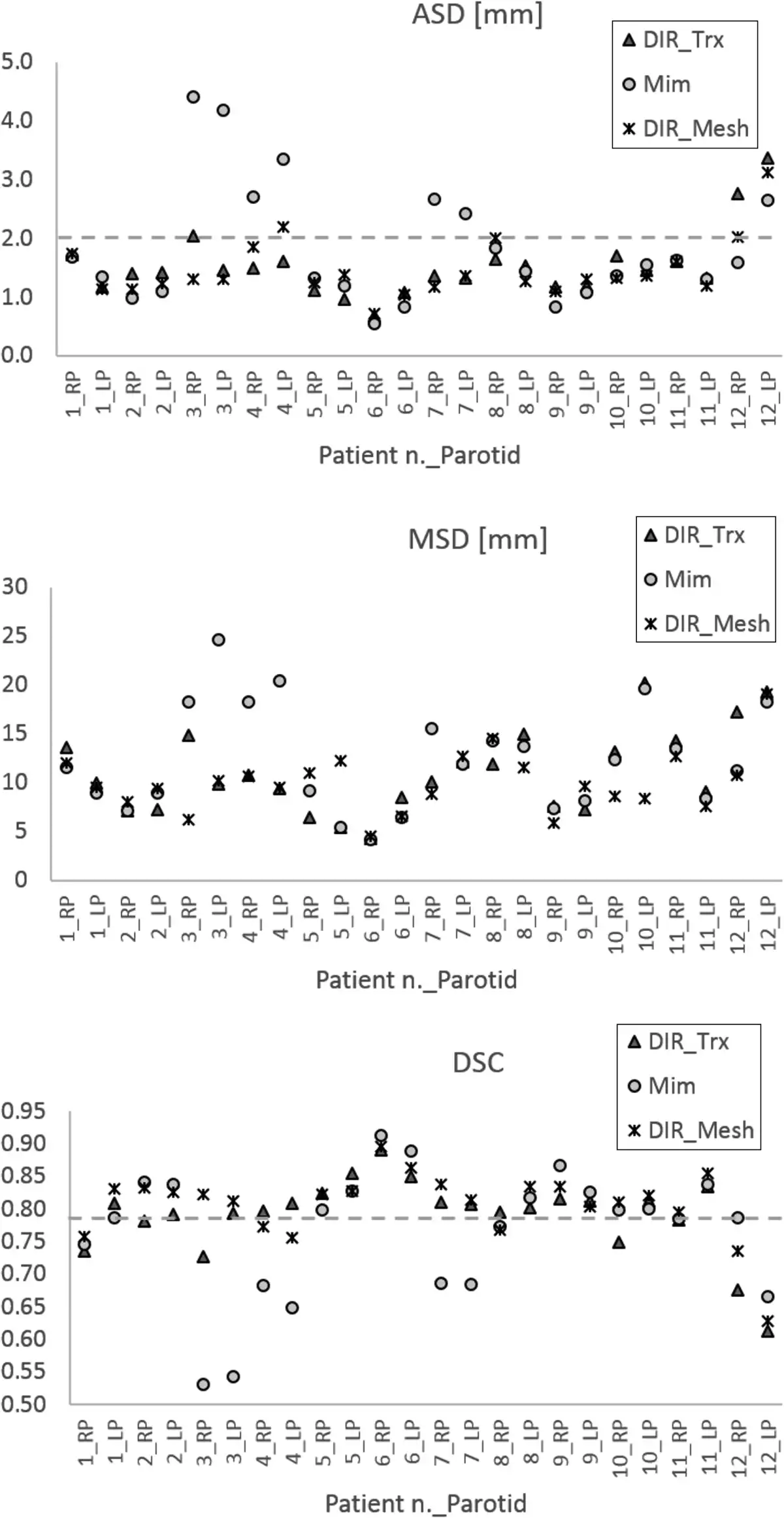 Average symmetric distance (ASD), maximum symmetric distance (MSD), and Dice similarity coefficient (DSC) indices calculated for each patient and each parotid with the 3 different DIR methods (MIM, DIR_Trx, DIR_Mesh). LP indicates left parotid; RP, right parotid.