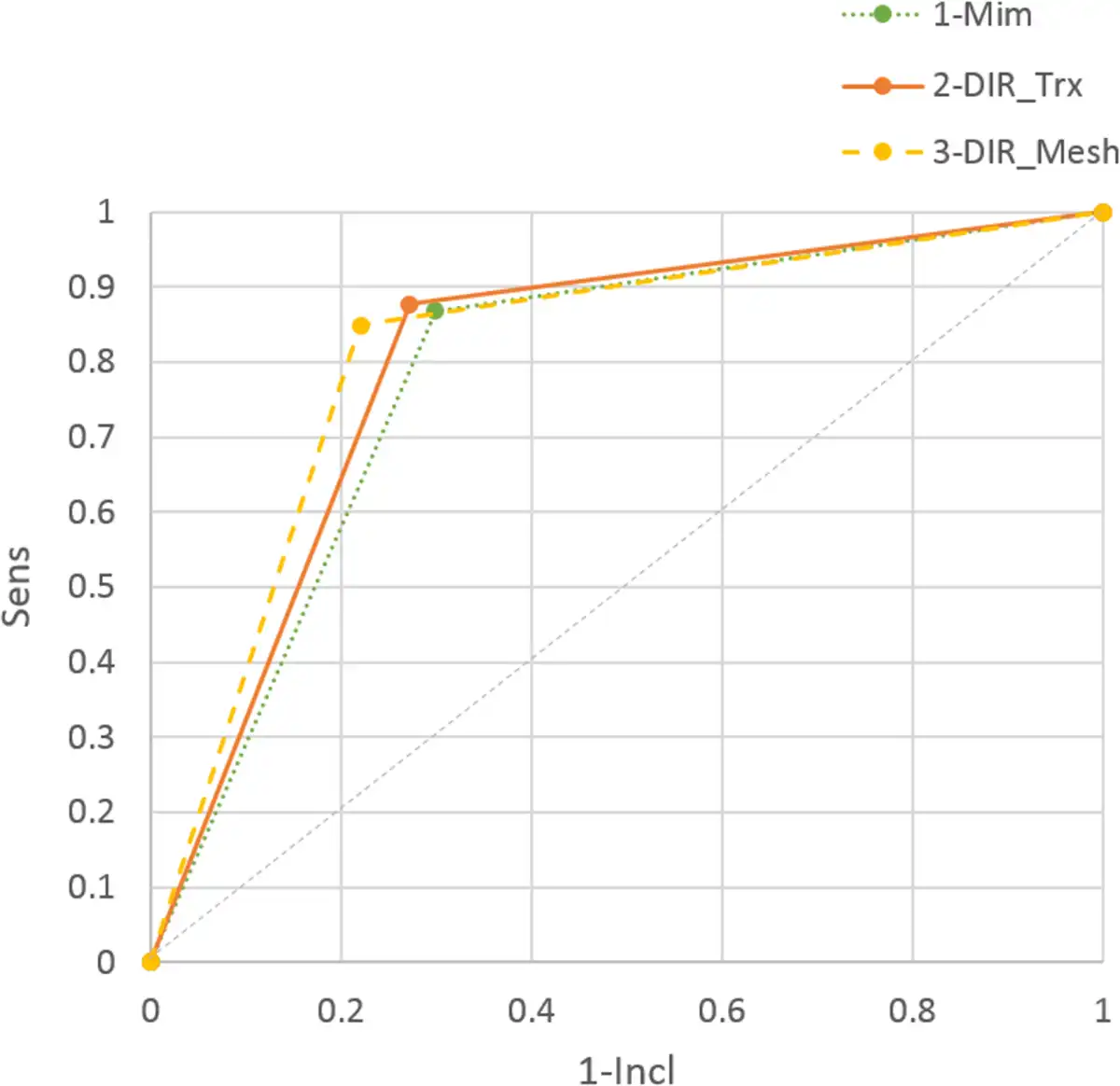 In Figure 4, the modified ROC curve is shown; as already reported in Table 3, DIR_Mesh performed slightly better than the other 2 methods, having an area under the curve higher than the others, although nonsignificant (P value = .26).