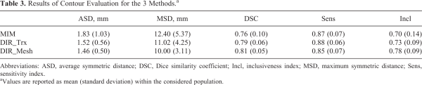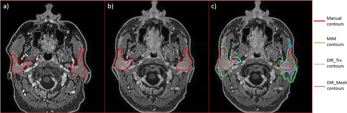 Nowadays, these methods are commercially available and implemented in clinical software, and thus, they are widely used in clinical practice. This kind of software provides the advantage of being easily implemented in the clinical settings as well as a reduced time required for all processes, which makes this approach very feasible for use in daily routine. Moreover, they are built to be robustly effective in a large spectrum of different applications. At the same time, there is the potential risk that the desired reduction in computational time and the not specific setup could lead to a diminished DIR accuracy. In fact, it has been shown that, in critical situations (ie, large deformation, discrepancy between images, etc), commercial software can lose some DIR accuracy. Among the available commercial software solutions, MIM (v6.3; MIM Software, Cleveland, Ohio) is increasing its relevance in radiotherapy applications, and many validation studies and clinical applications for CT/CT monomodality DIR have already been reported , ; however, the registration between MRI acquired before and after the treatment has not been completely evaluated yet.