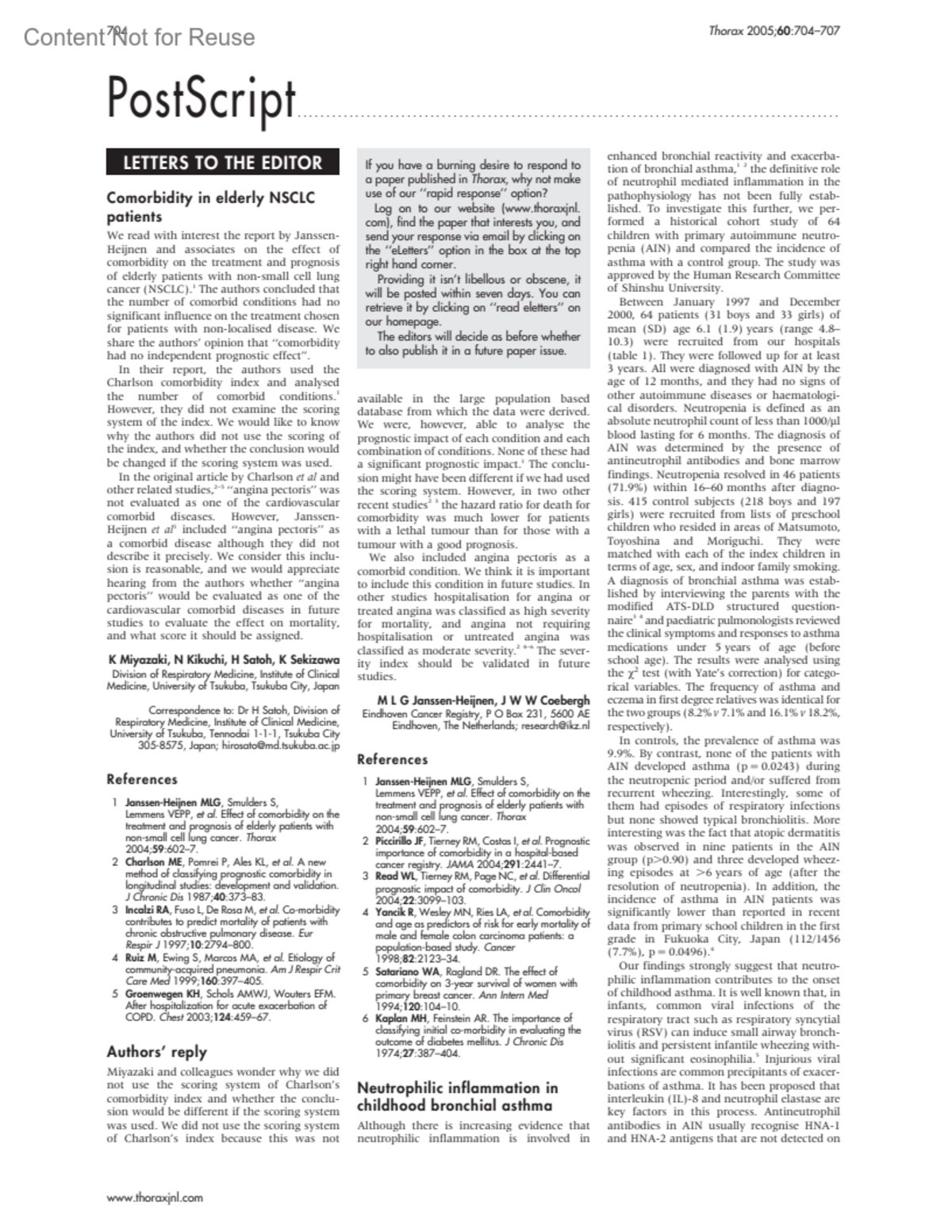 Comorbidity in elderly NSCLC patients: Authors’ replyJanssen-Heijnen, M L GCoebergh, J W WAuthor informationEindhoven Cancer Registry, P O Box 231, 5600 AE Eindhoven, The Netherlands; [email protected]Thorax 60(8):p 704, August 2005.Copyright © 2005 BMJ Publishing Group Ltd & British Thoracic Society