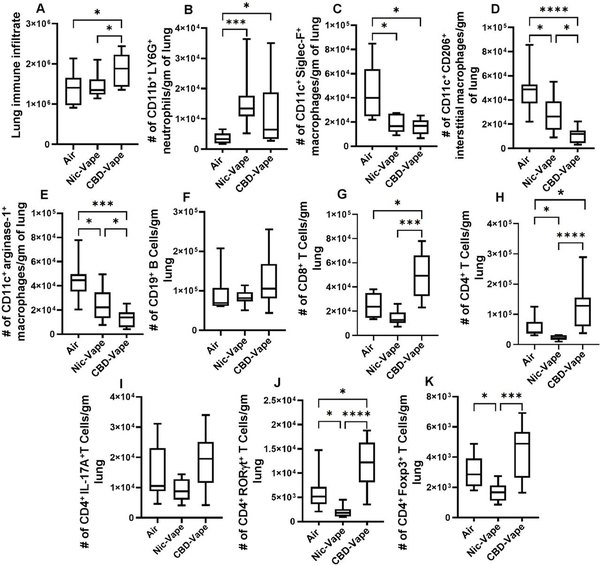 Impact of acute exposure to CBD or nicotine aerosols on pulmonary immune-cell infiltration. Total number of leucocytes (A), CD11b+Ly6G+ neutrophils (B), CD11b- CD11c+Siglec-F+ macrophages (C), CD11b- CD11c+CD206+ macrophages (D), CD11b- CD11c+arginase+ macrophages (E) and numbers of CD19+ B cells (F), CD8+ T cells (G), CD4+ T cells (H), CD4+IL17A+ (I) and CD4+RORγt+ inflammatory T cells (J) and CD4+FOXP3+ T cells (K) in the lungs of mice exposed to air, nicotine, or CBD aerosol were determined by flow cytometry using specific markers and following a gating strategy as described previously and shown in online supplemental figure 1. Data are shown as box plots with whiskers at min and max. Difference between two groups is considered significant at p<0.05, statistical significance of the difference between two groups is indicated with symbols *p<0.05; ; ***p<0.001; ****p<0.0001after performing non-parametric Kruskal-Wallis test with false discovery rate (FDR) correction for multiple comparisons by GraphPad Prism V.9 software (GraphPad; La Jolla, California, USA). In each exposure condition, n=10 mice (5 males+5 females) (n=9 (5 males+4 females) for Nic-Vape) were used. CBD, cannabidiol.