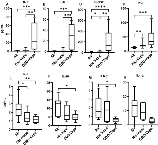 Modulation of the inflammatory cytokine/chemokine milieu in the BAL fluid following inhalation of CBD and nicotine aerosols. Levels of various inflammation-related cytokines and chemokines in the BAL (A–H) of mice after 2 weeks of exposure to air, Nic-Vape aerosols or CBD-Vape aerosols were quantified using MILLIPLEX MAP Kit as described in materials and methods. Data are shown as box plots with whiskers at min and max. Non-parametric Kruskal-Wallis test with FDR correction for multiple comparison was performed to see if statistically significant differences exist between two groups using GraphPad Prism V.9 software (GraphPad; La Jolla, California, USA). Difference between two groups is considered significant at p<0.05 and are indicated with symbols *p<0.05; **p<0.01; ***p<0.001; ****p<0.0001. In each experiment n=10 for CBD-vape and air exposure (5 males+5 females) and n=9 (5 males+4 females) for Nic-Vape). CBD, cannabidiol.