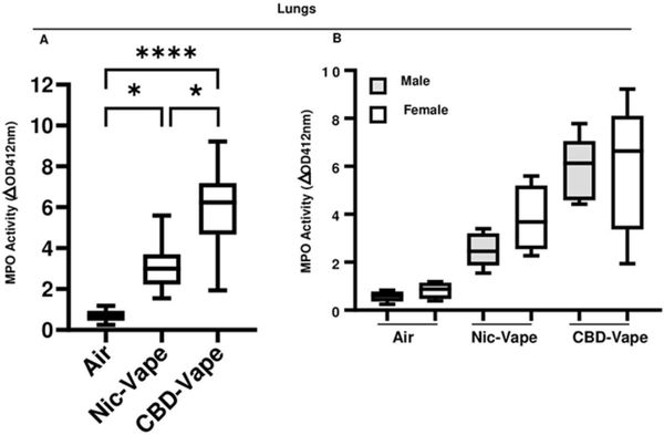 Augmentation of the myeloperoxidase (MPO) activity in lungs after exposure to CBD and nicotine aerosols. (A, B) We measured MPO activity in lung tissue lysates of nicotine or CBD aerosol-exposed animals using MPO assay kit from Abcam as described in detail in the supplemental material section. Left panel depicts data as males+females, while right panel represents data as male versus females. Data shown as box plots with whiskers at min and max. Non-parametric Kruskal-Wallis test with FDR correction for multiple comparisons was performed to see if statistically significant differences exist between two groups using GraphPad Prism V.9 software (GraphPad; La Jolla, California, USA). Difference between two groups was considered significant at p<0.05 and is indicated with the symbols *p<0.05, ****p<0.0001. In each experiment n=10 mice for air and CBD-vape exposures each (5 males+5 females) and n=9 for Nic-Vape group (5 males+4 females). CBD, cannabidiol; FDR, false discovery rate.
