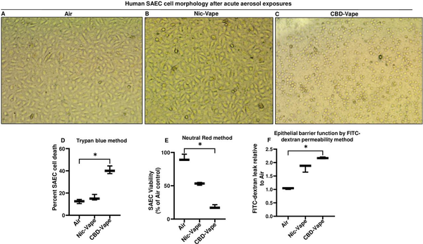 We observed that when human SAECs were exposed in vitro to CBD aerosols for 1 hour, epithelial cell morphology was markedly disrupted (figure 8A,B vs 8C). Cell death in hSAECs was significantly increased only following CBD aerosol-exposure when compared with air (41% vs 12.5% in air control; p<0.05) (figure 8D,E). Even though the cell death following CBD-Vape exposure was higher compared with exposure to nicotine aerosols, it, however, did not reach statistical significance (41% vs 16% in Nic-Vape). Additionally, exposure to CBD aerosols diminished the epithelial barrier integrity of human SAECs compared with air by 2.1-fold (p<0.05) and while the exposure to nicotine aerosols also showed an increased trend, it was not significantly different compared with air-control (1.7-fold decrease in Nic-Vape vs air control) (figure 8F).