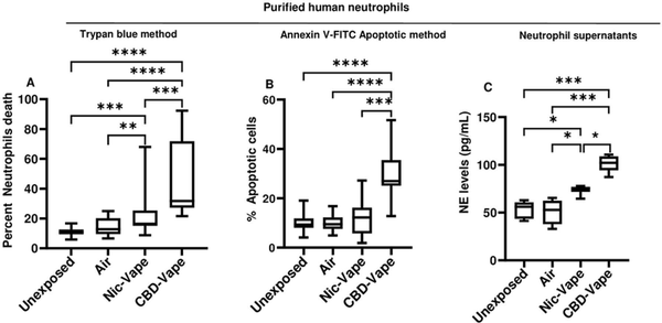 Apoptotic cell death in purified human neutrophils and levels of neutrophil elastase (NE) released after exposure to CBD and nicotine aerosols. Human neutrophils purified from whole blood were seeded at 0.8 million cells/culture insert in a 6-well plate format and immediately exposed to 110 puffs of Air, nicotine (50 mg/mL nicotine) or CBD (50 mg/mL)-containing aerosols at the air–liquid interface in a 55 mL puff volume as described in the Methods section. At the end of the exposures, cells were removed from the ALI chamber and recovered in complete growth media for 24 hours. Next, cell death was measured using (A) trypan blue dye-exclusion assay and (B) annexin V-FITC apoptosis as mentioned in detail in the Methods section. Immediately after isolation, an aliquot of the purified neutrophils was kept in complete medium in a CO2 incubator as negative ‘unexposed controls’ for the entire duration of the assay, to estimate the extent of cell death, induction of apoptosis, or NE levels in the absence of any exposure. (C) Levels of NE were quantified in conditioned media harvested after recovery period ended by performing NE ELISA as discussed in the Methods section. Data are depicted as box plots with whiskers at min and max from independent experiments each performed in triplicate. For apoptosis assay: average data from n=5 donors per group. For trypan blue method: average data from unexposed control n=6 donors, air control and Nic-Vape n=7donors, and CBD-Vape n=8 donors. For NE assay average data from n=6 donors per group). Difference between two groups was considered significant at p<0.05 which is indicated with the symbols *p<0.05, **p<0.01, ***p<0.001, ****p<0.0001 calculated using non-parametric Kruskal-Wallis test with FDR correction for multiple comparisons by GraphPad Prism V.9 software (GraphPad; La Jolla, California, USA). ALI, air–liquid interface; CBD, cannabidiol; FDR, false discovery rate.