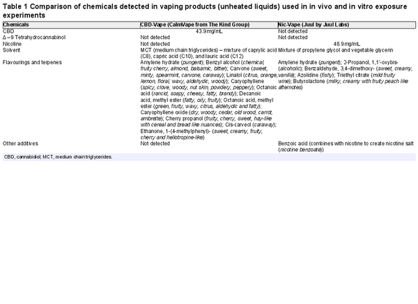 Although several studies have examined the respiratory effects of vaping nicotine, to our knowledge, this is the first report that demonstrates that even short-term exposure to vaporised CBD alters the inflammatory milieu in the lung, leading to lung damage. It is important to note that we used CBD-containing vaping products devoid of THC, to eliminate any potential influence of THC on pulmonary effects. Due to legal restrictions in accessing vaping products containing THC, we were unable to conduct experiments that would also compare the effects of THC vaping. A single recent study reported that CBD in vaping products can be considered as a precursor of THC, thus compounding the problem further by inducing CBD-independent, THC-mediated effects related to general use of cannabis vaping products. Furthermore, any respiratory toxic effects of vaping could potentially be exacerbated by the presence of other constituents of vaping products, including different solvents (MCT in CBD product and PG:VG in nicotine products), different flavours and terpenes present in both products as revealed by product analysis. Numerous potential degradation byproducts were detected in both heated solutions, suggesting that both products are susceptible to high temperatures. However, higher levels of carbonyl compounds were detected in CBD-containing aerosol, suggesting that CBD vaping product used in our study may have been more susceptible to thermal degradation compared with nicotine product. This may be due to differences in chemical composition of two solutions and/or differences in vaporisation conditions inside vaping devices.