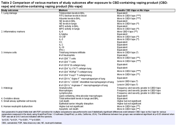 Numerous markers of inflammation and pulmonary damage measured in our study were consistently higher after exposure to CBD-containing vaping product than nicotine-containing vaping device. For example, we report that inhalation of aerosolized CBD vape oil caused a much stronger enhancement in the numbers of both CD4+ and CD8+ T cells, and high numbers of neutrophils in the lungs. A similar profile of increased neutrophils and modulation of CD4+ and CD8+ T cells was seen in the lung of a patient who had vaped cannabis oil causing lung injury and respiratory failure. A tight nexus exists between inflammatory T cells, neutrophil-mobilising factors and neutrophil recruitment in pulmonary inflammatory disorders. An increased inflammatory milieu in the lungs after exposure to CBD aerosols could orchestrate accumulation and/or activation of neutrophils in the bronchoalveolar space directly, via release of specific neutrophil-mobilising factors like IL-6, G-CSF and KC (CXCL1) or indirectly via activation of resident lung macrophages and epithelial cells. It is also possible that CBD aerosols could damage lung epithelium and initiate a process of neutrophil recruitment and activation via mechanisms including local tissue damage. Indeed, we demonstrate that CBD aerosols damage epithelial integrity and induce cell death in hSAECs, suggesting that CBD aerosols could directly induce lung-tissue damage and activate DAMPs to mediate pulmonary inflammation.