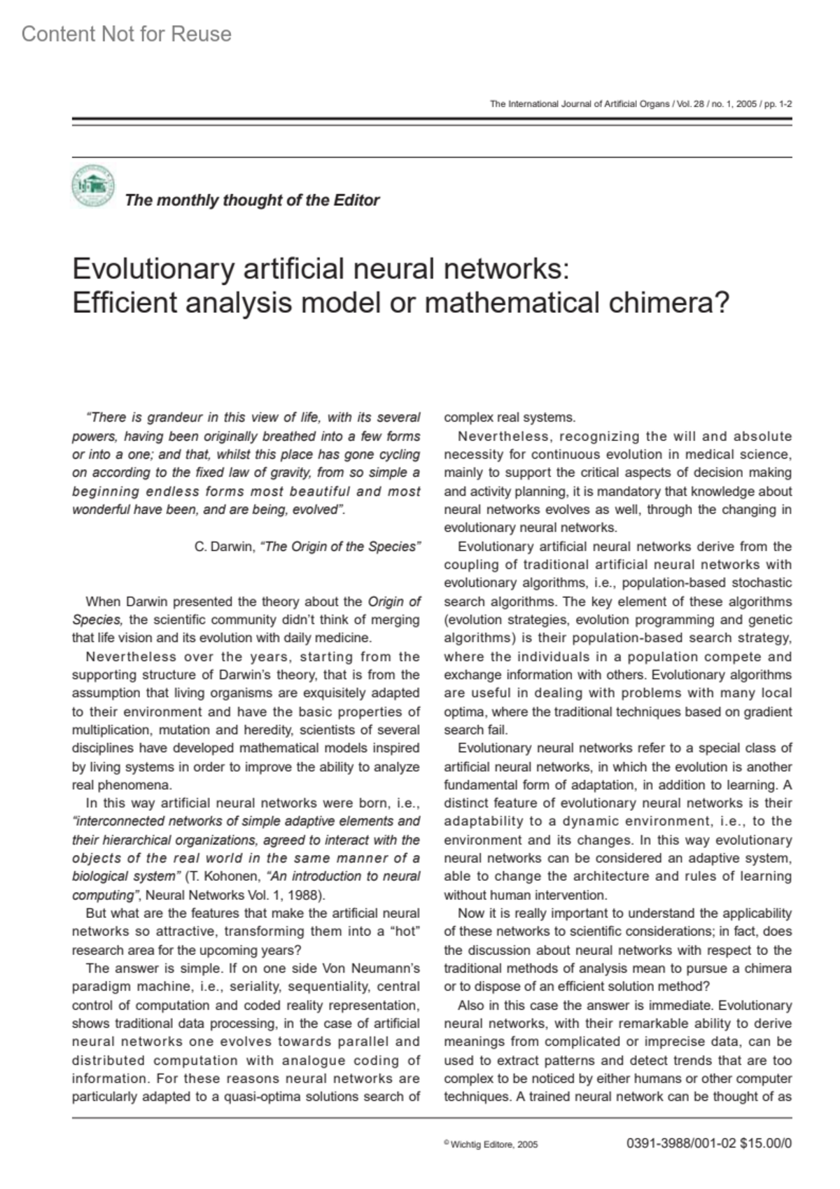 Evolutionary artificial neural networks: Efficient analysis model or mathematical chimera?Author informationAddress for correspondence: Claudio Ronco, MD Department of Nephrology St. Bortolo Hospital Vicenza, Italy e-mail: [email protected]The International Journal of Artificial Organs 28(1):p 1-2, January 2005.Copyright © 2005 Wichtig Editore
