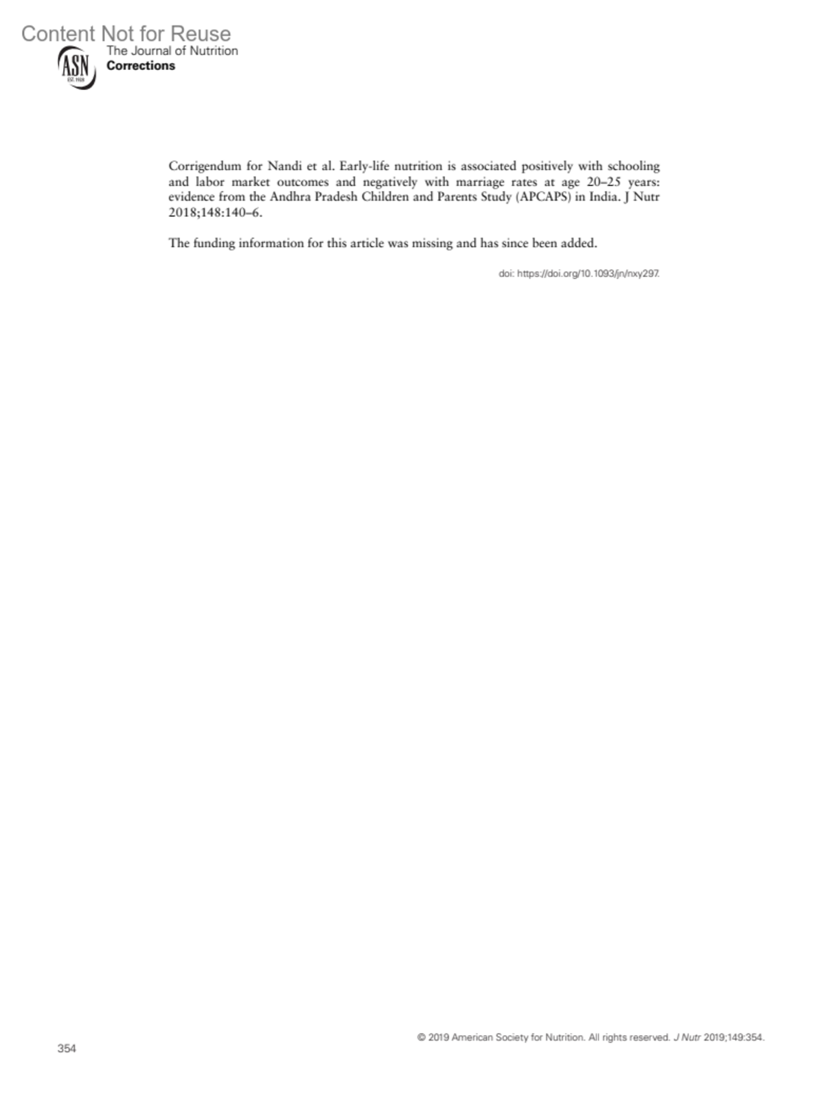 Corrigendum for Nandi et al. Early-life nutrition is associated positively with schooling and labor market outcomes and negatively with marriage rates at age 20–25 years
