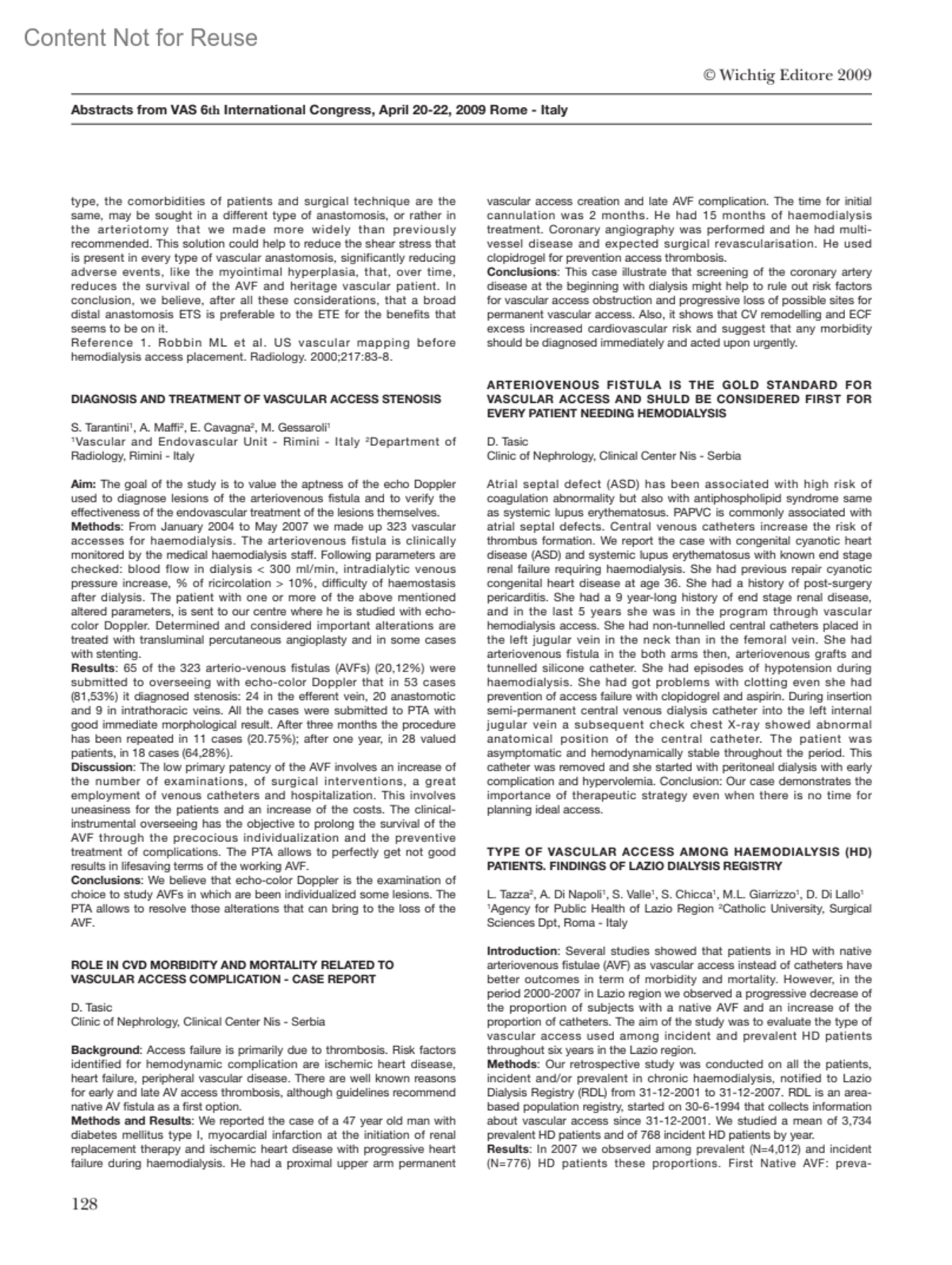 ROLE IN CVD MORBIDITY AND MORTALITY RELATED TO VASCULAR ACCESS COMPLICATION - CASE REPORTTasic, D.Author informationClinic of Nephrology, Clinical Center Nis - SerbiaThe Journal of Vascular Access 10(2):p 128, April-May-June 2009.Copyright © 2009Wichtig Publishing - Milano (Italia)
