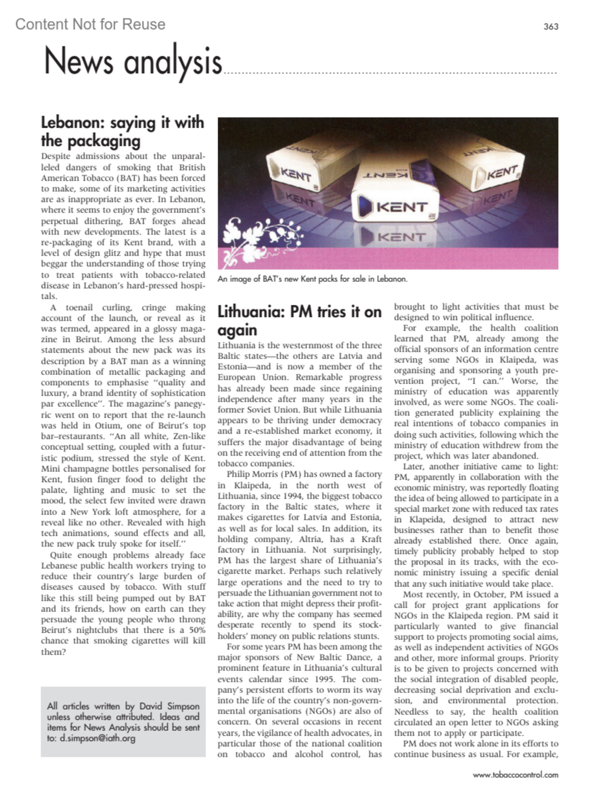 Lebanon: saying it with the packagingSimpson, DavidAuthor information[email protected]Tobacco Control 16(6):p 363, December 2007.Copyright © 2007 BMJ Publishing Group Ltd