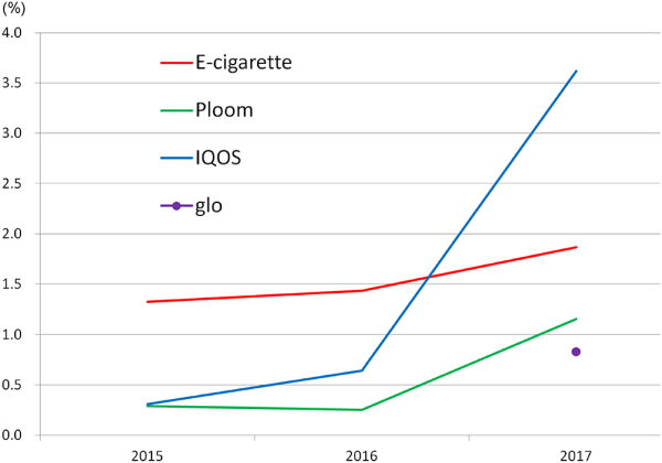 Mass media influence people’s behaviour through direct and indirect product marketing. In Japan, HNB tobacco IQOS was picked up on a popular TV programme Ame-talk in April 2016, in which many popular Japanese comedians discussed their IQOS use, which seems to have led to interest in the product by viewers. The market share of IQOS-specific tobacco sticks has increased in Japan, reaching 4.9% of all tobacco products, including combustible cigarettes, by October 2016. In an earlier study of HNB/e-cigarette use in Japan, 6.6% had ever used the product(s) and 1.3% had used in the previous 30 days. Among electronic smoking device ever-users, e-cigarettes accounted for the majority; Ploom and IQOS only accounted for 7.8% and 8.4%, respectively, in 2015.