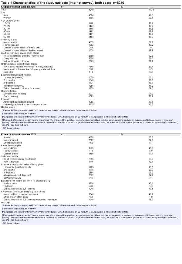 Characteristics of study participants are shown in table 1 (for all three waves in online supplementary table S1). Of total baseline subjects, 50% were male, 59% were never-smokers and 6% were ever-users of HNB tobacco/e-cigarette in 2015. Distribution of respondents in follow-up surveys was adjusted close to baseline distribution, using IPWs.