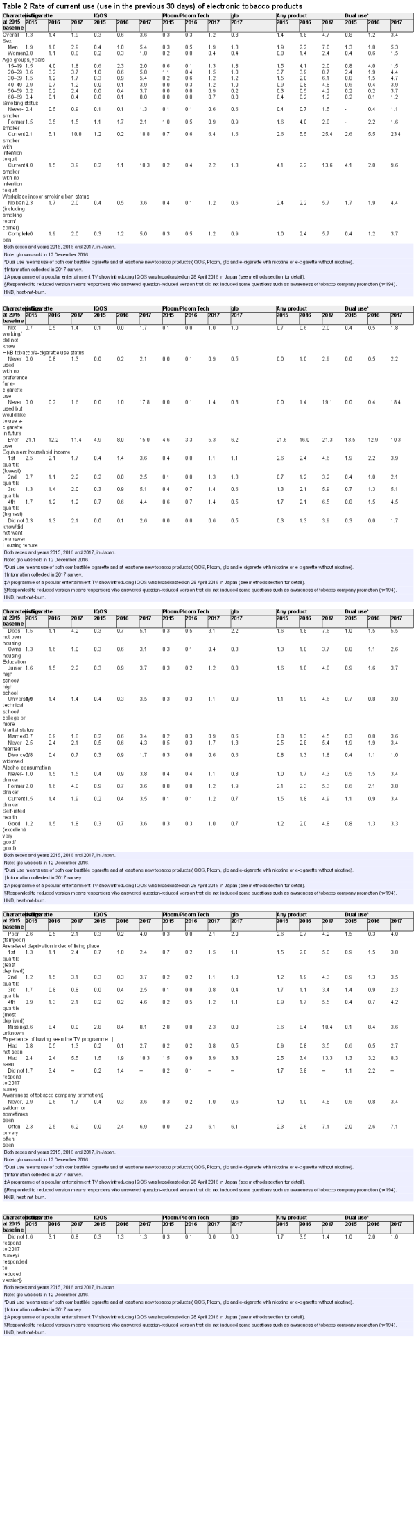 Panellists were asked about their current use (use in the previous 30 days) of each product (e-cigarettes, Ploom, IQOS and glo) in the 2015, 2016 and 2017 surveys (glo was included in 2017 only, because it only entered the market in December 2016). The term ‘Ploom Tech’ was used instead of Ploom in 2017, following the product change. Respondents who answered ‘yes’ to the question, ‘Have you used the following products in the previous 30 days?’ (options: e-cigarette, Ploom, IQOS and glo) were defined as current users of the designated product(s). Current combustible cigarette smokers who had concurrently used any HNB tobacco or e-cigarette in the previous 30 days were defined as dual users.