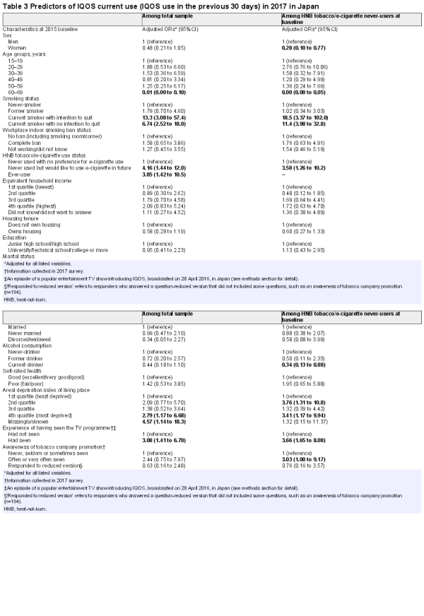 Predictors of IQOS current use (use in the previous 30 days) in 2017 are shown in table 3. AOR of baseline current smokers with intention to quit was significantly higher than that of those with no intention to quit (13.3 vs 6.7). AOR of respondents who had seen the TV programme was significantly higher (3.1) than that of those who had not. Women, aged 60 years or more, and current drinkers showed significantly lower AOR than reference categories. Ever-use or no use with preference of e-cigarette use, most deprived area of living place and experience of awareness of tobacco promotion were associated with greater odds of using IQOS.